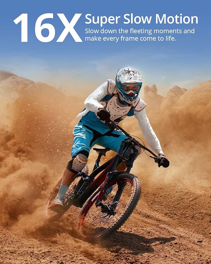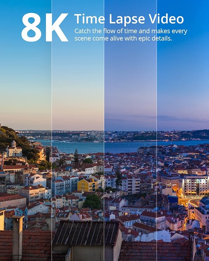 - 【8K Time Lapse & 16x Slo-Mo】 – With 8K time-lapse function, you can capture the flow of time of nature, such as the color change of the sky from day to night, making every scene come alive with epic details. With 16x Slo-Mo function, the camera can capture up to 400 frames per second at 720P in astonishing 16x Slow Motion videos.