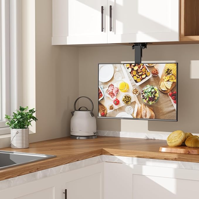 - Ideal Design: This flip down tv mount is ideal for ceilings, cabinets, bedrooms, offices, kitchens, and workspaces. With its adjustable function, you can save your room space at the most, even the corner, while enjoying perfect viewing angle.
