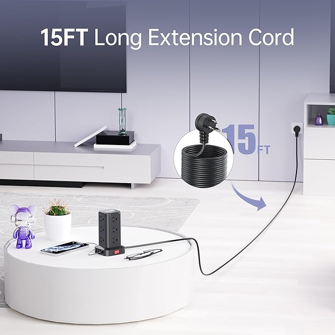 - 【15FT Power Strips with Surge Protection 】The 15FT upgraded extension cord with multiple outlets is made of pure copper. Reinforced design at the junction of the stand of power strip tower and the wire head. To protect the terminal from wear and tear. Environmental protection and fire-resistance PC shell with flame retardant at 1382℉ makes it more safe and longer lifetime.