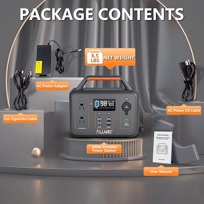- Included Components : 1* AC Cable, 1* DC Car Cable, 1* AC Power Adapter, 1* ALLWEI 300W Portable Power Station, 1* User Manual, 1*ALLWEI 100W Solar Panel built-in 5.5*2.1MM 1* AC Cable, 1* DC Car Cable, 1* AC Power Adapter, 1* ALLWEI 300W Portable Power Station, 1* User Manual, 1*ALLWEI 100W Solar Panel built-in 5.5*2.1MM