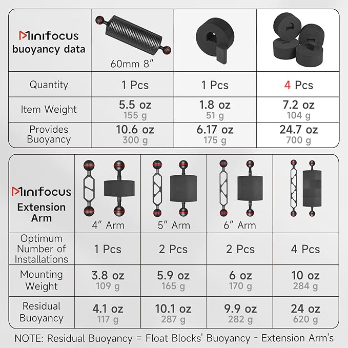 - Professional Support: Please feel free to contact us for any issues, a satisfied solution is promised forever; Made from premium polymeric materials, the buoyancy floating arm can withstand the harsh underwater environment, ensuring long-term use; Package includes: 4x buoyancy kits, 1x storage bag