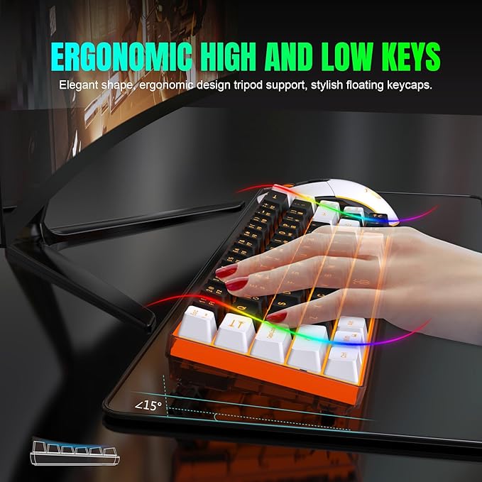Snpurdiri 60% Wireless Gaming Keyboard and Mouse Combo,Orange Backlit Rechargeable 2000mAh Battery,Mini Mechanical Feel Anti-ghosting Keyboard + Popular RGB Mice for Gaming, Office(Black-White)