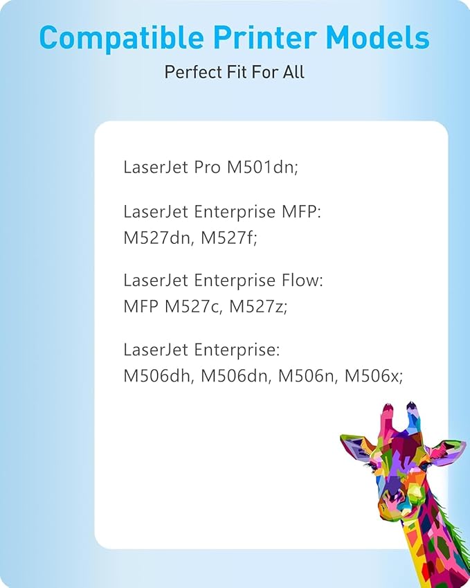 - Compatible Models: Designed for HP LaserJet Pro M501dn; LaserJet Enterprise MFP M527dn, M527f; LaserJet Enterprise Flow MFP M527c, M527z; LaserJet Enterprise M506dh, M506dn, M506n, M506x printers.