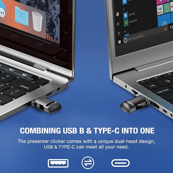 - 【2-IN-1 USB Type C PRESENTATION CLICKER】The presenter clicker comes with a unique dual-head design, USB & TYPE-C can meet all your need. You can smoothly switch between different port devices such as Mac, laoptop and pc, one for multiple computers. At the bottom of the slide clicker there is a magnet which can hold your USB dongle securely. (Powered by 2pcs AAA Battery are not included)