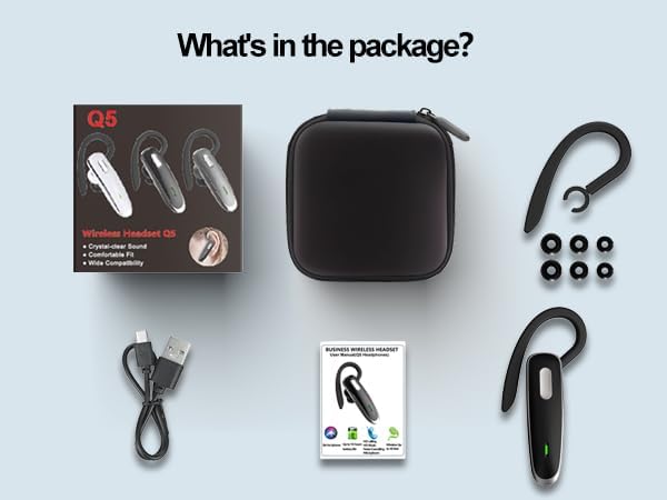 - 【WHAT YOU GET】 Q5 Bluetoth headset has 12 months replacement warranty and offers 24 hours customer services. Package contents: 1*bluetoth headset, 6*Ear tips, 1*Ear hook, 1*TYPE-C cable, 1*Manual, 1*zip storage case