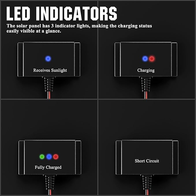- Visual Charging Status: The controller has 3 indicator lights: blue (sunlight exposure); red (charging); and green (battery full). Easily monitor the charging process
