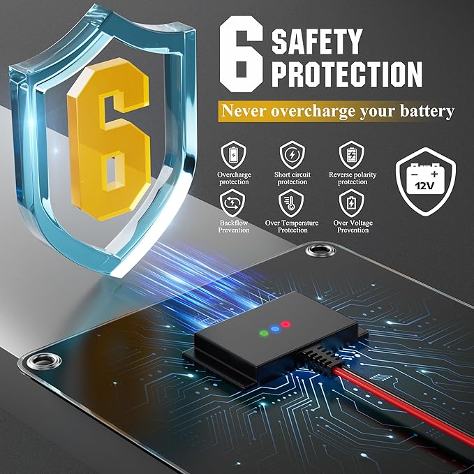 - No Overcharging, No Battery Drain: The solar panel includes a built-in controller that prevents overcharging. When the battery is full, the controller stops charging automatically and resumes when the voltage drops. Our solar panel system won’t drain your battery