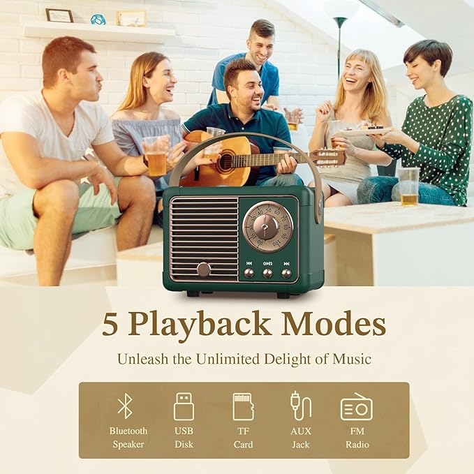 - ♫【Hands-free Call】This wireless retro speaker utilizes Bluetooth 5.0 technology, it can effortlessly pair with almost all Bluetooth-enabled devices. Enjoy the freedom of hands-free calling, as our rechargeable radio bluetooth speaker allows you to answer calls with a single press of a button. Never miss an important call while immersing yourself in your favorite music.