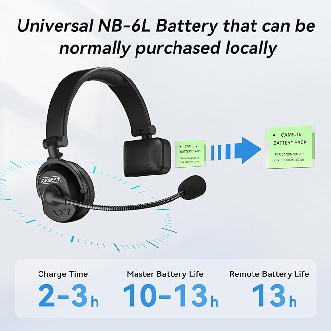 - 【Universal NB-6L Battery &10hrs+ Runtime 】The runtime of the master headset can last 10 hrs, and the remote headsets can last about 13 hrs. Always keep in touch with your team for communication.CAME-Waero Wireless Intercom Headsets feature a NB-6L style battery that can be normally purchased locally