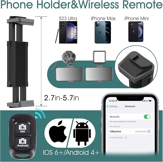 - 【Universal Phone Holder & Wireless Remote】Our tripod boasts a universally adjustable phone holder, accommodating smartphones from 2.8 to 5.7 inches. Furthermore, it comes equipped with a wireless remote that seamlessly syncs with your mobile device, enabling you to effortlessly capture photos and videos from distances of up to 30 feet (10 meters).