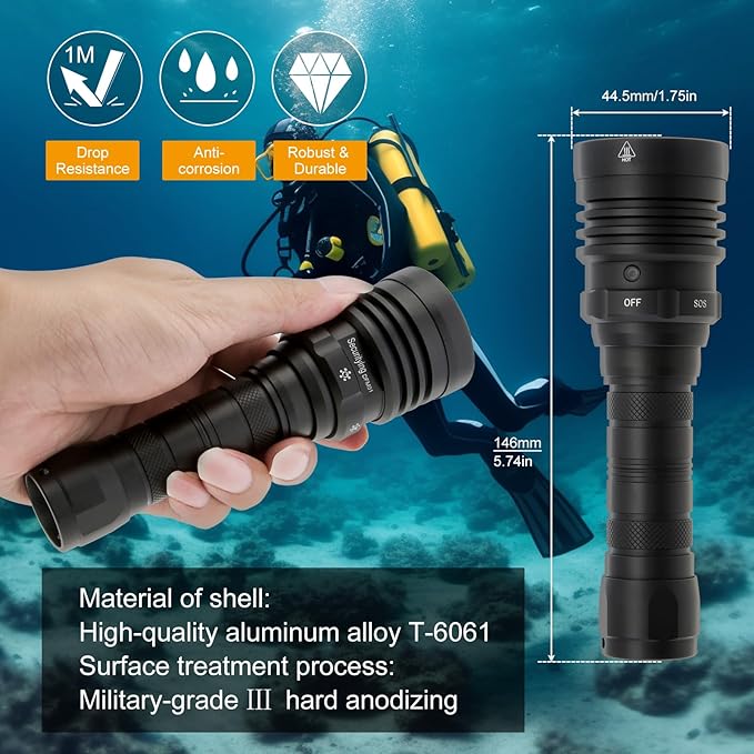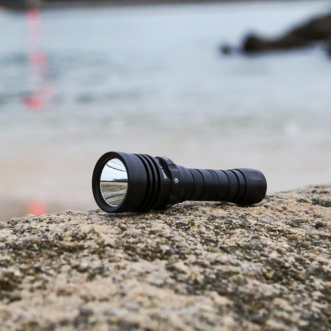 - 【Ultra-Bright 6500K Underwater Vision】: scuba diving flashlight providing 5000K super bright neutral white light underwater,cuts through murky water and restores natural underwater colors,making it ideal for underwater photography and videography.Its 15° narrow beam reaches up to 220m/721ft, giving you clear visibility and confidence in deep or low-light underwater environments,dive torch is ideal for beginner diver,professional divers, coaches, and underwater photographers