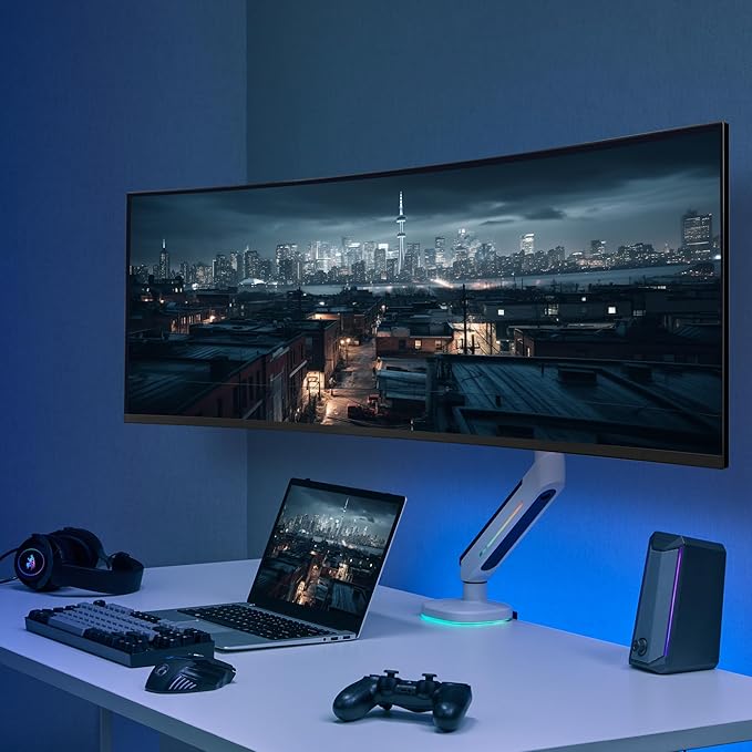 AVLT Single 27”-45” RGB Gaming Monitor Arm Desk Mount Built-in 20 Lighting Modes Touch Button Control Fits Flat/Curved/Ultrawide Screens Height Swivel Tilt Rotation Adjustable Stand -White