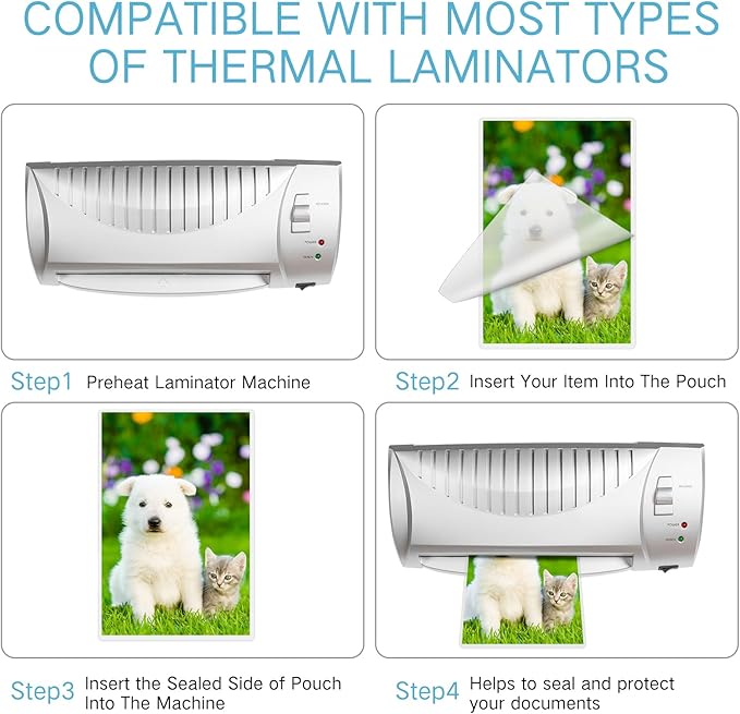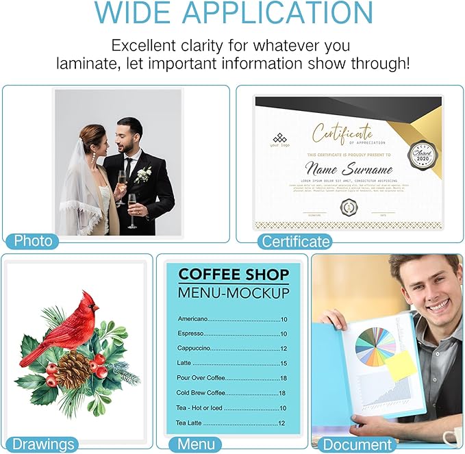 - Wide Application: these thermal pouches for laminator are not limited to preserving documents; They can also be applied to photographs, certificates, recipes, cards, and more; From business presentations to family memories, these laminating sheets help protect what's important