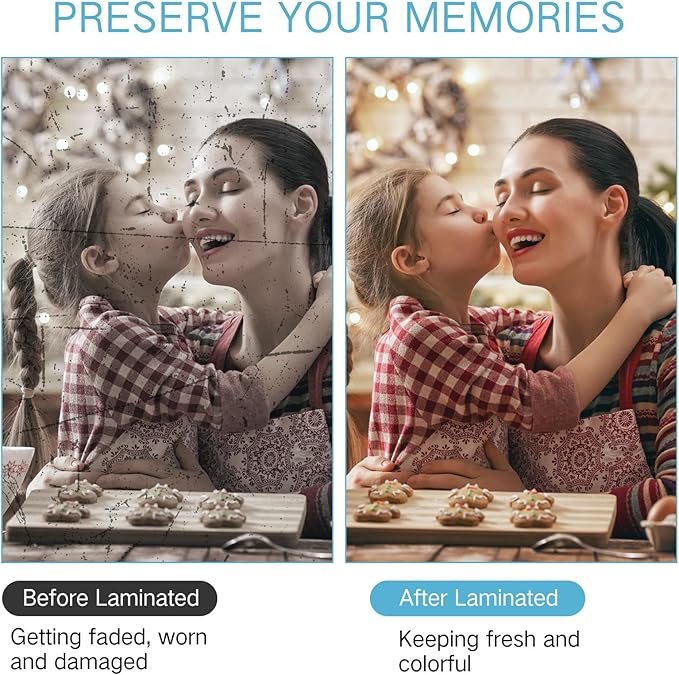 - Large Size: these photo laminating sheets measure about 8.6 x 12 inches for letter size paper up to 8.5 x 11 inches; This larger size provides ample space for documents, ensuring that your items are fully protected and are easy to handle; You can comfortably laminate full sized pages without cropping or trimming the edges