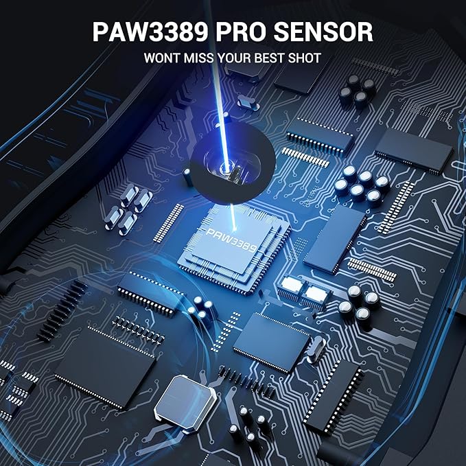 - E-SPORTS SENSOR: This Professional Gaming Mouse equipped with the PAW3389 Optical Pixart sensor, the mouse with 1000Hz Polling Rate, and 26,000 max dpi sensitivity plus zero smoothing, filtering, or acceleration