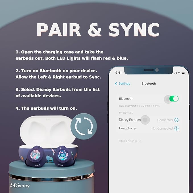- Compatibility: Our Disney bluetooth earbuds are designed to be compatible with all your favorite devices. Whether you have a cell phone, tablet, smart watch, computer, laptop, or any other Bluetooth-enabled device, you can easily connect and start enjoying your favorite content right away.