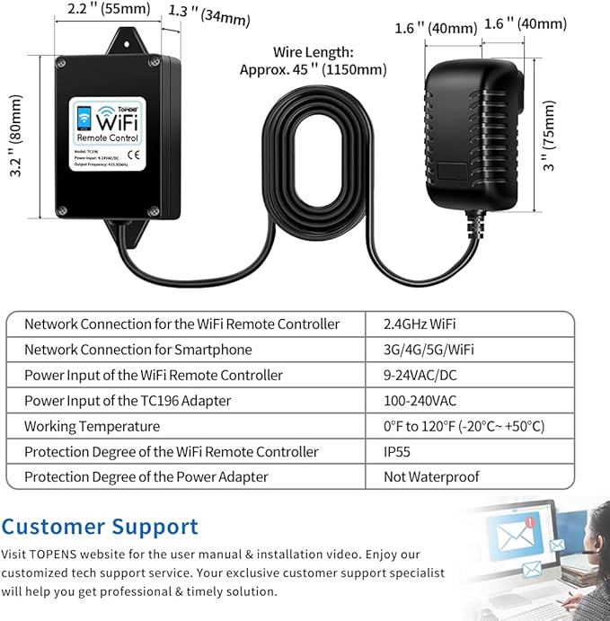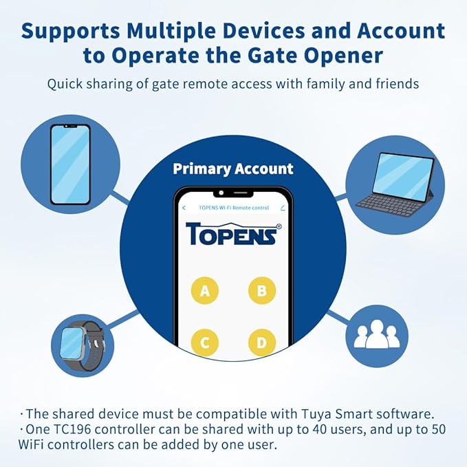 - Smart Control - TOPENS TC196 WiFi controller is designed to open or close the gate remotely using a smartphone. Whether you're at home or on vacation, you have full control over the gate's operation. It allows you to control the gate from anywhere when the remote controller is connected with WiFi. Once paired, the WiFi remote control can also work via Bluetooth even if there is no WiFi signal. Enjoy the ease and convenience of instant gate access with one touch on the phone.