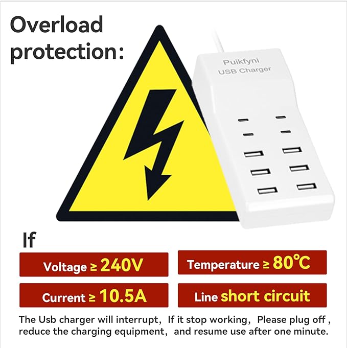 - Certified Safe: MultiProtect safety system ensure complete protection for you and your devices.Integrated IC control circuit, including overload, overvoltage, overcurrent, short circuit protection, over temperature protection, etc:If the demand of the equipment is overloaded, For example: the total current used by the port exceeds 10A,the charging station will automatically short-circuit and power off.