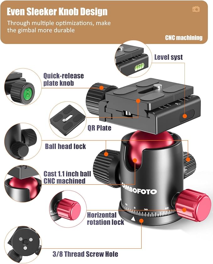 - 【Smooth Ball Head】The aluminum ball and housing are precision CNC-machined to deliver seamless and effortless angle adjustments for your shots. Durable and refined, it features bubble levels that ensure your frame remains perfectly horizontal.