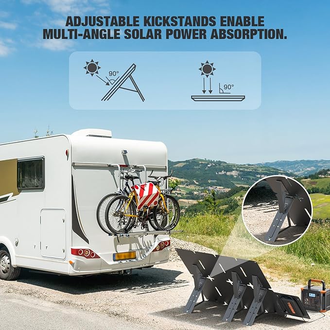 - DURABLE KICKSTAND & EASY TO USE - Using the removable kickstands instead of laying the panel flat on the ground allows it to absorb 25% more sunlight. Unfold all the solar panels in outdoor sunlight, then connect your devices to the output ports, and get power in seconds. Note: this solar charger can't store electricity.