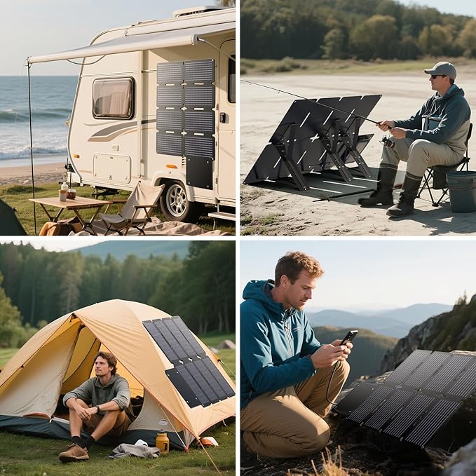 - 24% HIGH CONVERSION RATE - 80W solar panel changer is made with premium mono-crystalline UV-resistant EVA and efficient solar cells with high light transmission ETFE material, generates energy from the sunlight, and perform better with 24% higher conversion efficiency, providing unlimited green power for your device under the sun. Smart charging technology with built-in smart chip intelligently identifies your device and provides the best charging speed according to different devices.