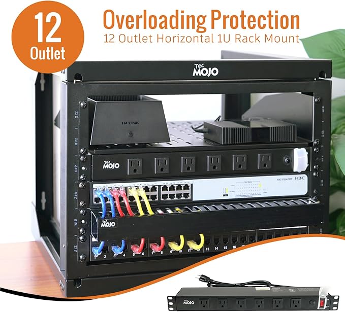 Tecmojo 1U Rackmount Network-Grade PDU Power Strip, 12 Wide-Spaced Right Angle Outlets, Circuit Breaker 12A (UL Certified 12A) 6ft Cord w/ 5-15P Plug, Black