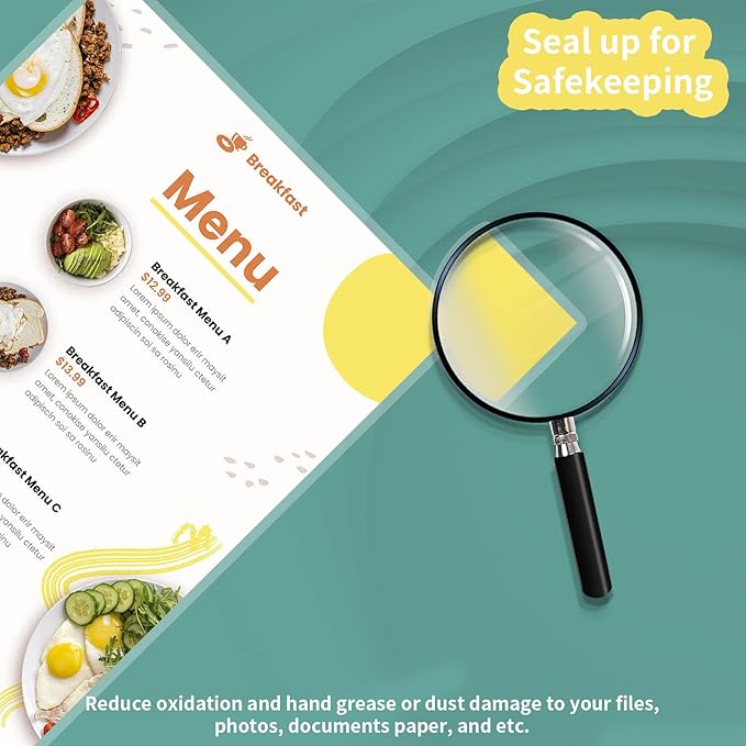 - 💌SEAL UP FOR SAFEKEEPING: Laminating sheets is made of high-quality PET film + EVA adhesive layer, strong adhesion, flat and not easy to generate air bubbles, and can be stored for a long time. Laminating paper can reduce damage to documents, photos, paper, etc. caused by hand grease or dust, and oxidation loss.