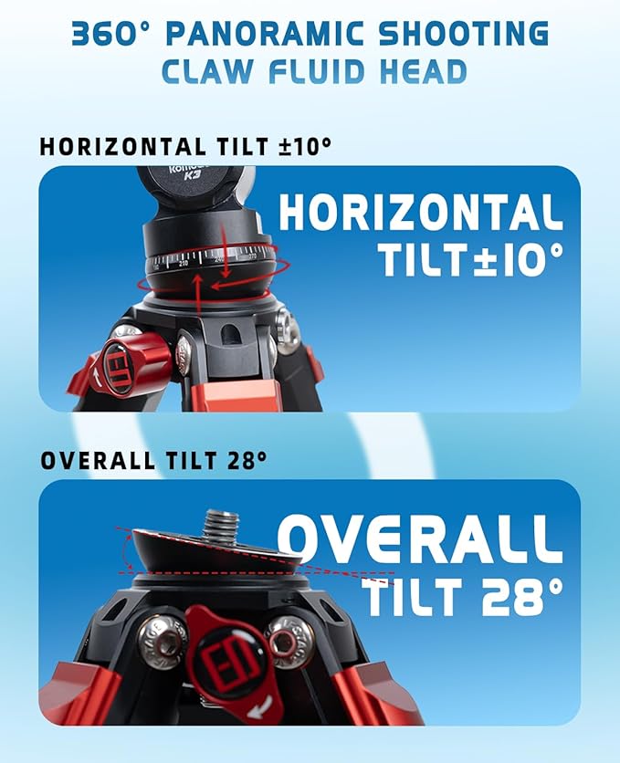 - 【360° Adjustable Leveling Platform】The platform offers ±10° of horizontal adjustment range and a 28° tilt capacity. When paired with the K3 gimbal system, it enables extended tilt angles beyond standard specifications, significantly enhancing your cinematographic versatility and creative shooting potential.(K3 head tilt angle +90° to -83° ).