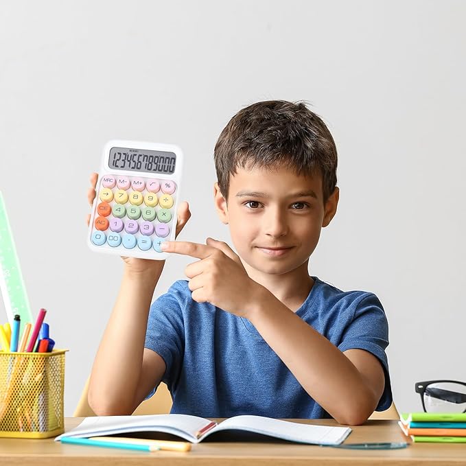 Mechanical Pushbutton Calculator,12 Digit Large LCD Display,Big Buttons Easy to Press,Colorful Candy Calculator,Automatic Sleep,with Battery.for Office,School, Home. (White)