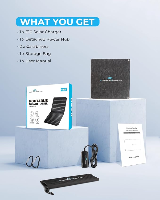 - 【YOU WILL GET & CUSTOMER SERVICE】Package List: 10w Solar Panel ×1, Detachable Power Hub×1, Carabiners×2, User Manual ×1, Storage bag ×1. We promise 18 months warranty, if there's any problem about the product please contact us and we will reply to you in 24 hours.