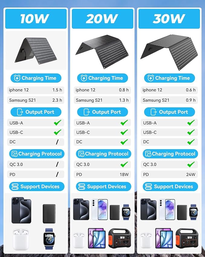 - 【EQUIPPED 12W HIGHER-POWER SOLAR CELLS 】To provide a better user experience, the actual design power of our solar panel is 12W, which is 20% higher than the rated power. The actual output power of solar powered charger is affected by encapsulation and weather, so most solar panels on the market do not reach the rated power.