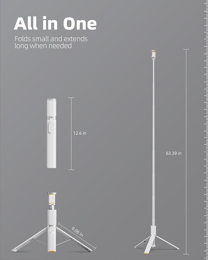 - Selfie Stick Tripod All-in-one Design: Our Portable Tripod boasts an advanced and compact engineering, providing the utmost in portability and space-saving design. Effortlessly fold and store it in a mere second, guaranteeing your travel convenience