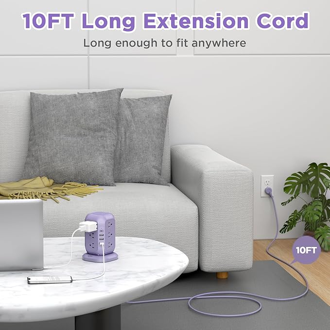 - 10 FT Extension Cord with Stable Construction:The power surge protector extension cord 10FT long extension cord can give you more flexibility in small space; The power strip with USB ports is very solidly constructed, inspiring confidence in the unit's safety; The vertical design of this power strip tower is much better than a traditional horizontal strip for the relatively large power supplies you need to plug in