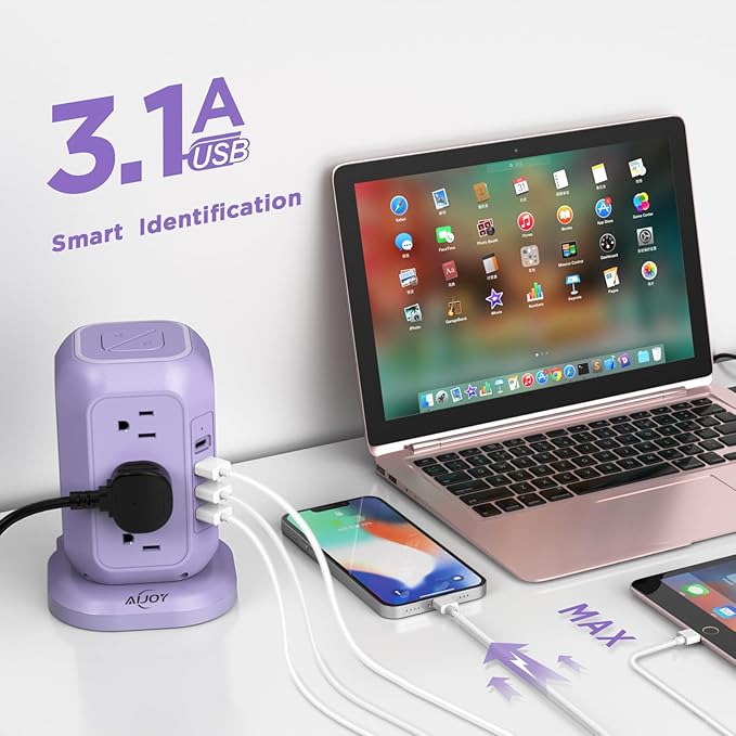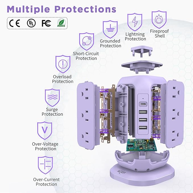 - 1200J Enhanced Safety Features: Power strip surge protector has passed FCC, RoHS certification, this surge tower has surge protection, overload protection, short circuit protection, lightning protection. The power tower charging station use the ceramic SPD to automatic cut off the power fastly when voltage surge is detected, to ensure you a safe charging environment; The power tower has a reset button, in case the maximum voltage is exceeded and the unit shuts down
