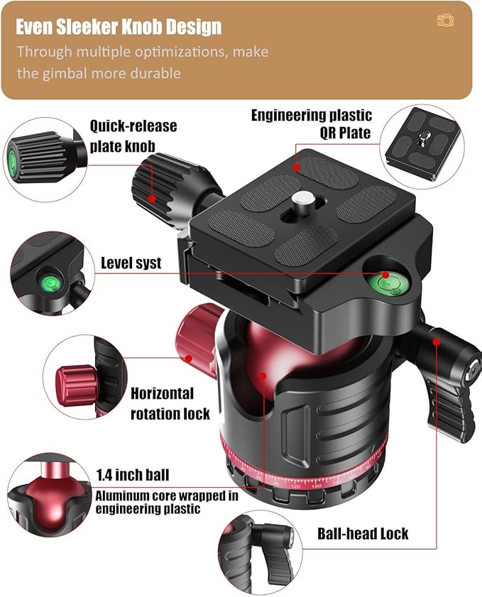 - 【UPGRADED NEW PRODUCT】We have significantly improved the craftsmanship of this tripod stand: 1. The tripod components are crafted using CNC machining, resulting in minimal tolerances. As a result, adjusting the camera's angle on the ball head feels as smooth as silk. 2. We've optimized the ball head structure, removing unnecessary accessories to further reduce weight. 3. The load-bearing components are cast in a single piece and made from high-strength engineering plastic, ensuring exceptional durability and lightweight design.