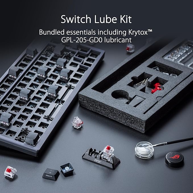- Included accessories: ROG switch opener, keycap and switch pullers, a lube station and brush, Krytox GPL-205-GD0 lubricant, 3 ROG NX switches, 8 stabilizer mats, a USB dongle and extender, a USB cable, a ROG sticker, a quick start guide, and a warranty booklet.