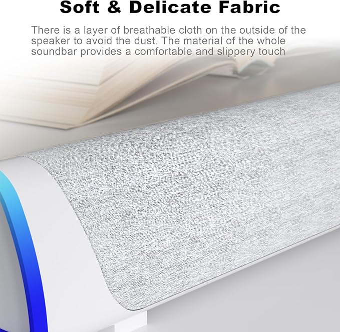 - Slanted Design: The 30-degree micro-inclined design allows the sound to be better conveyed. There is a layer of breathable cloth on the outside of the speaker to avoid the dust. The material of the whole soundbar provides a comfortable and slippery touch