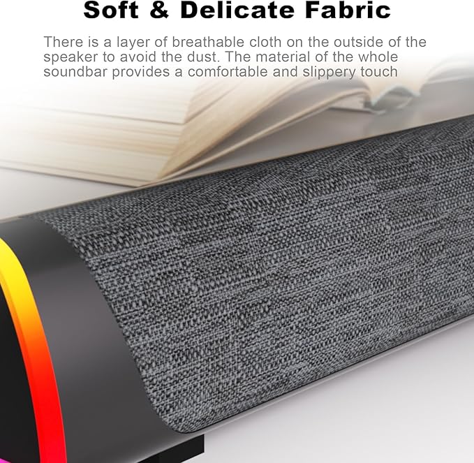 - Slanted Design: The 30-degree micro-inclined design allows the sound to be better conveyed. There is a layer of breathable cloth on the outside of the speaker to avoid the dust. The material of the whole soundbar provides a comfortable and slippery touch
