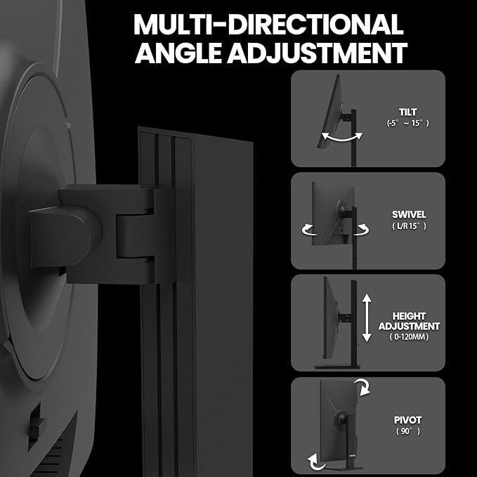 - 【Ergonomic Design】The vertically rotating monitor stand supports a 90° rotation for portrait orientation. Easily switch to portrait mode for efficient multitasking, coding, or document editing, enhancing readability with lengthy documents. The height is adjustable within a range of 120 mm, with tilt (-5°~15°) and swivel (-15°~15°) for a personalized and comfortable viewing angle.Supports wall mounting (75 mm x 75 mm)