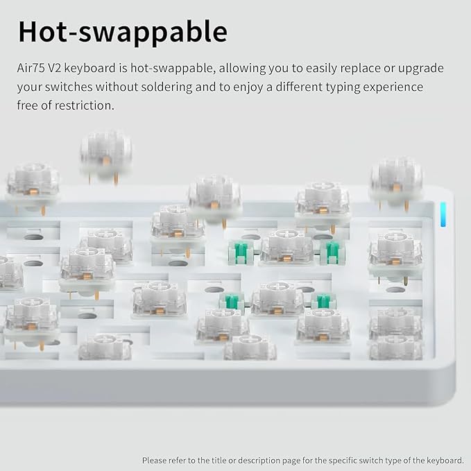 - Supports multi-device connectivity: Air75 V2 wireless mechanical keyboard is compatible with Mac/Windows/Linux/Android/iOS,and supports Bluetooth 5.1 connectivity, 2.4g connectivity and wired connectivity modes, which allows you to connect up to 4 computer devices at the same time and switch between these computers to use them, which can satisfy a wide range of entertainment office needs