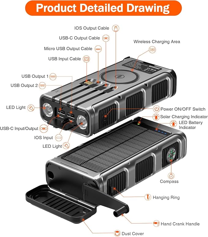 - Practical Outdoor Battery Pack: This solar portable charger has dual bright LED flashlights with 3 modes (SOS/Strobe/Steady) for power outages and other emergencies. The built-in compass clearly shows you the direction. It also comes with a carabiner, which you can hang on the backpack to charge this power bank through solar energy. It’s well-made to be waterproof/shockproof/dust-proof, suitable for various harsh environments.