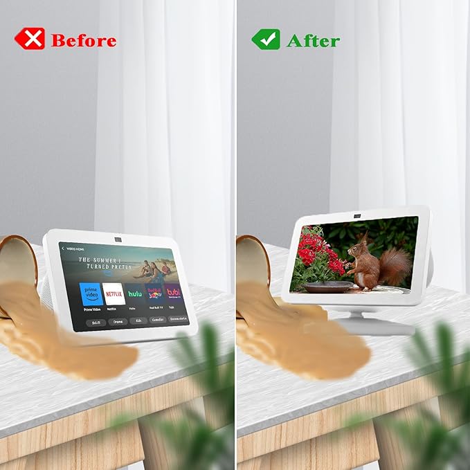 - [EASY INSTALLATION] Easily install your Echo Show 8 device onto the stand, the magnetic suction feature ensures a stable and reliable connection. Whether on the kitchen counter, nightstand or desk, our Echo Show holder offers versatile placement options that add convenience and functionality to any room.
