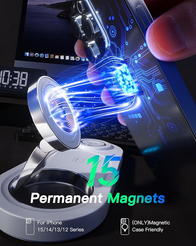 - Keep Cables Out of the Way: Our mag-safe 3-in-1 wireless charger eliminates tangled cables by charging your iPhone, Apple Watch, and AirPods simultaneously. Say goodbye to the cluttered and disorganized charging setup on your desk! Additionally, it's the ideal solution for frequent travelers or business trips, saving you time and effort by eliminating the need to carry multiple chargers