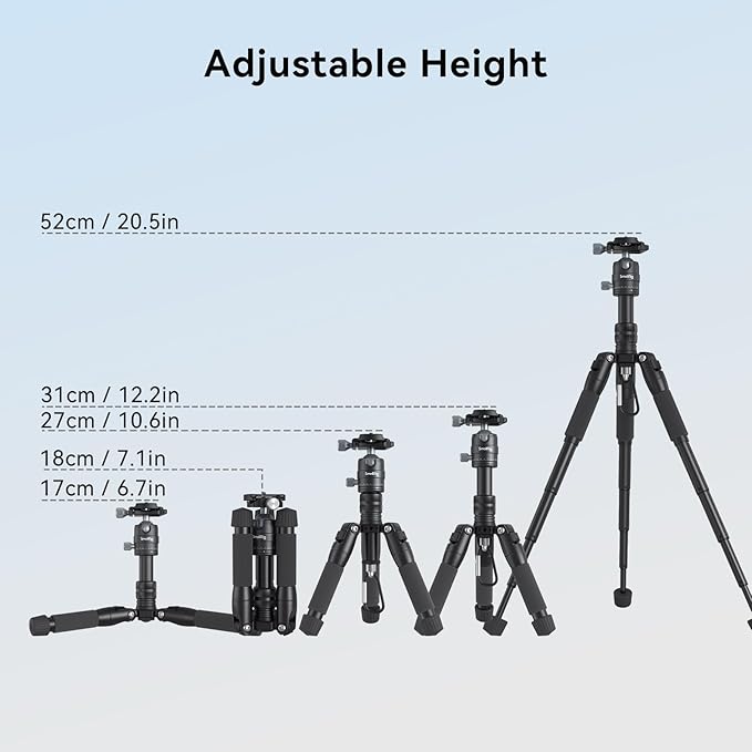 - 【Effortless Adjustments】Utilizing a 5-section leg design and a quick tightening mechanism, this mini tripod allows for quick and easy height adjustments, with a working height range of 17cm/6.7in to 52cm/20 in.