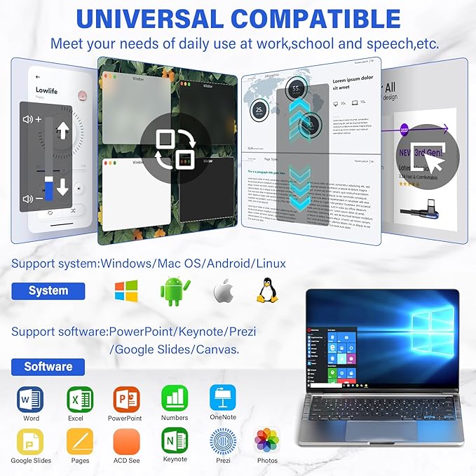 - Compatible Devices : Mac OS, Macbook, Chromebook, Windows, Linux, Android, HP, Lenovo, Surface Microsoft, PC, Desktop, Computer, Laptop, Projector Screen, MS Word, Excel, PowerPoint, Google Slides, Prezi, IWORK, Keynote, etc. Mac OS, Macbook, Chromebook, Windows, Linux, Android, HP, Lenovo, Surface Microsoft, PC, Desktop, Computer, Laptop, Projector Screen, MS Word, Excel, PowerPoint, Go… See more