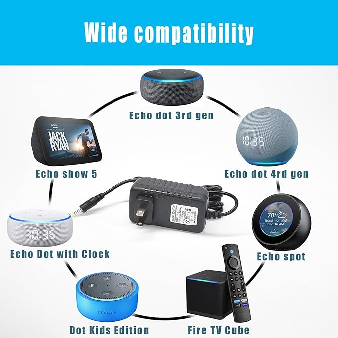 - ✅【COMPATIBILITY WITH】: 15W power cord adapter replacement compatible with the alexa voice echo pop 2023, Dot (3rd/4th/5th Gen), Echo Dot with Clock, Show 5 , Echo Spot,Fire TV Cube, Dot Kids Edition,c78mp8, gp92nb smart speakers,B7W64E, GP92NB, C78MP8, D9N29T, H23K37 and other media player streaming devices