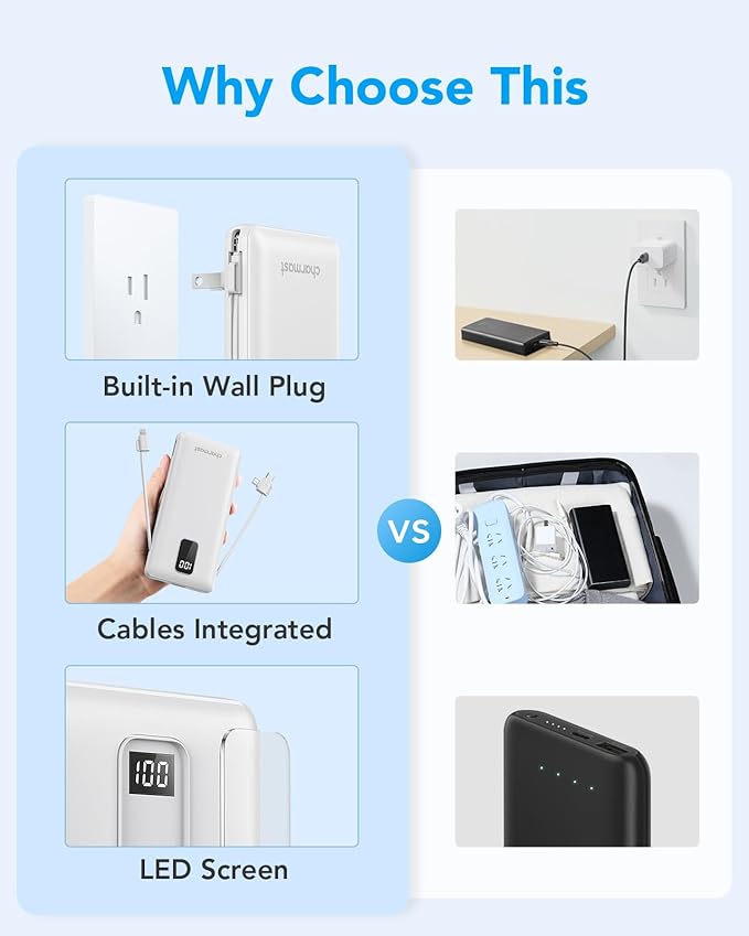 - Say goodbye to tangled wires and multiple chargers with the Charmast Portable Charger. Its built-in cables make it compatible with iPhone 16/16 Plus/16 Pro/16 Pro Max, iPhone 15/14/13 Series, Samsung Galaxy, all cellphones, so you can travel light without worrying about charging issue.