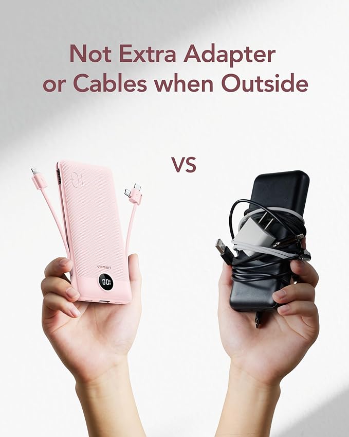 VEGER Portable Charger with Built-in AC Plug and Cables, All in One 10000mAh Ultra-Slim Power Bank, 15W Fast Charging for iPhone, Samsung, Android, Travel Essential (Crepe)