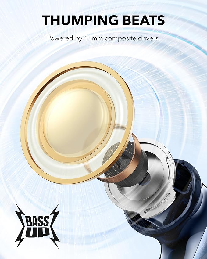 - Thumping Beats: soundcore P40i wireless earbuds feature 11mm composite drivers for an intensive audio experience, enhanced with BassUp technology for real-time intense bass.