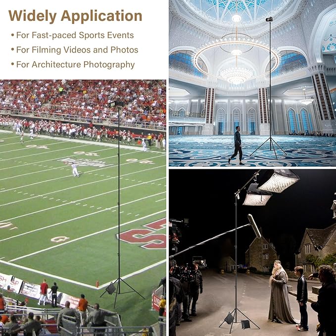 - What's in the Box: 1* 16.4' Tall Tripod Stand, 1* Carry bags, 3* SandBags. Perfect for high camera angels for videotaping sports. use these for field lights for soccer and they are a game changer with how tall and light weight they are.